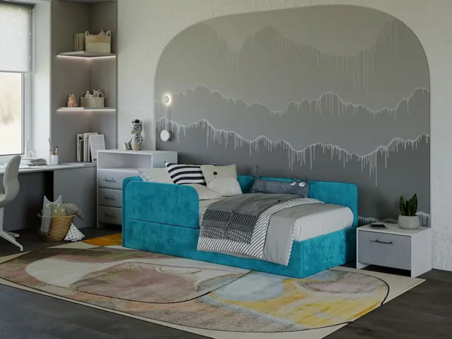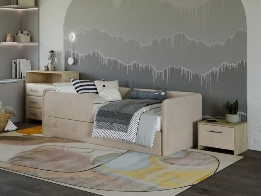Детская кровать, которая при желании превращается в угловую кровать или кровать-диван с подлокотниками-бортиками с обеих сторон.