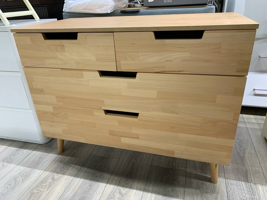 Комод Lagom на ножках, с четырьмя ящиками. Ящики комода оснащены направляющими полного выдвижения с доводчиками, а вместо ручек имеются фигурные вырезы в фасаде. Высота ножки - 16 см.