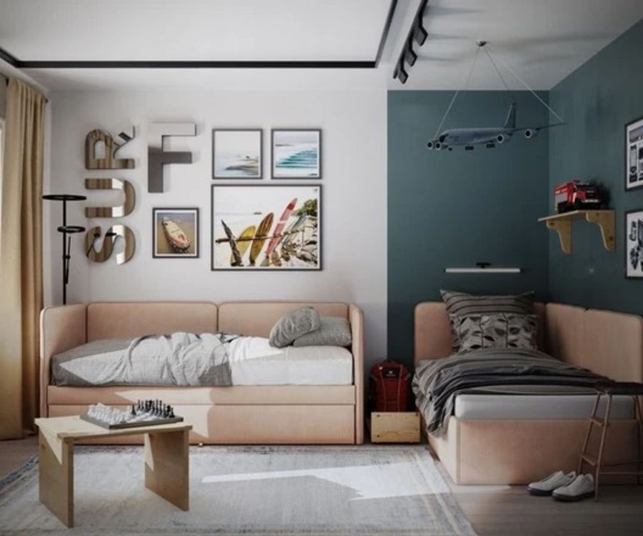 Кровать можно дополнить бортиком, который поможет зонировать пространство и сделать спальное место еще уютнее.