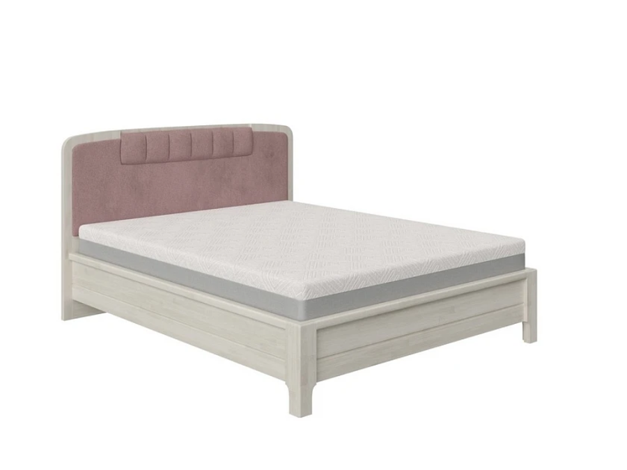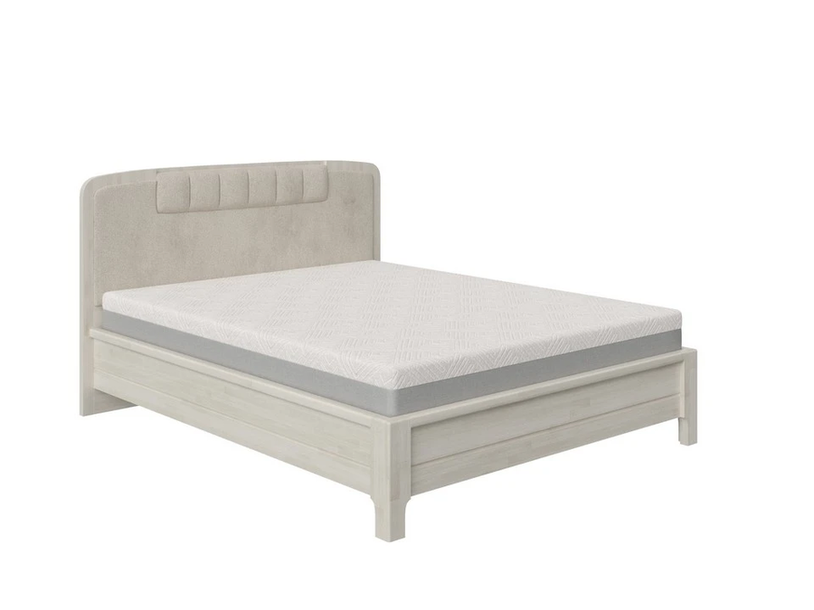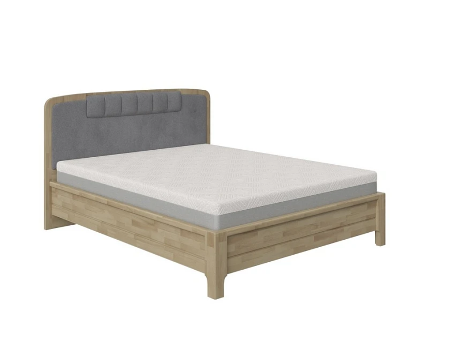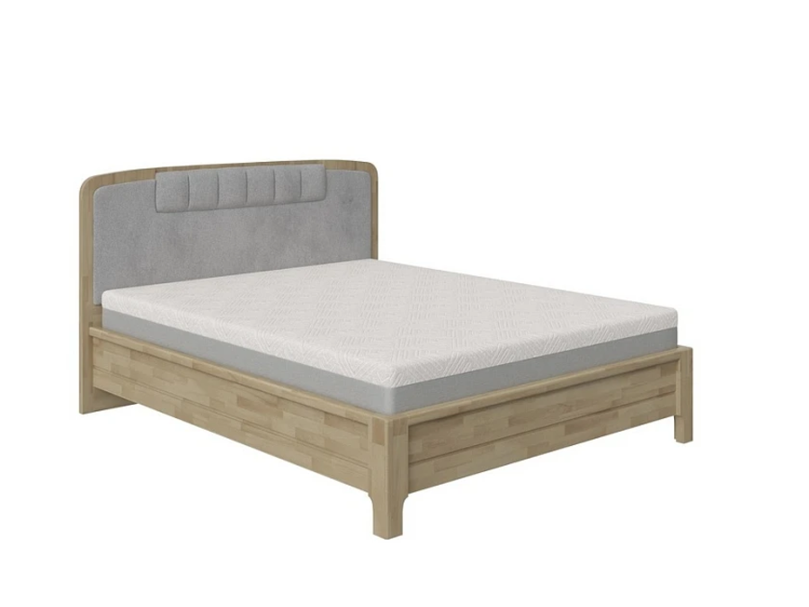 Изголовье выполнено в дизайнерском стиле с мягкой обивкой из износостойкой ткани. Оно не только создаёт выразительный акцент в интерьере, но и обеспечивает комфортную опору во время чтения или отдыха. Мягкие контуры и продуманная форма визуально смягчают массив дуба, придавая кровати гармоничный вид.